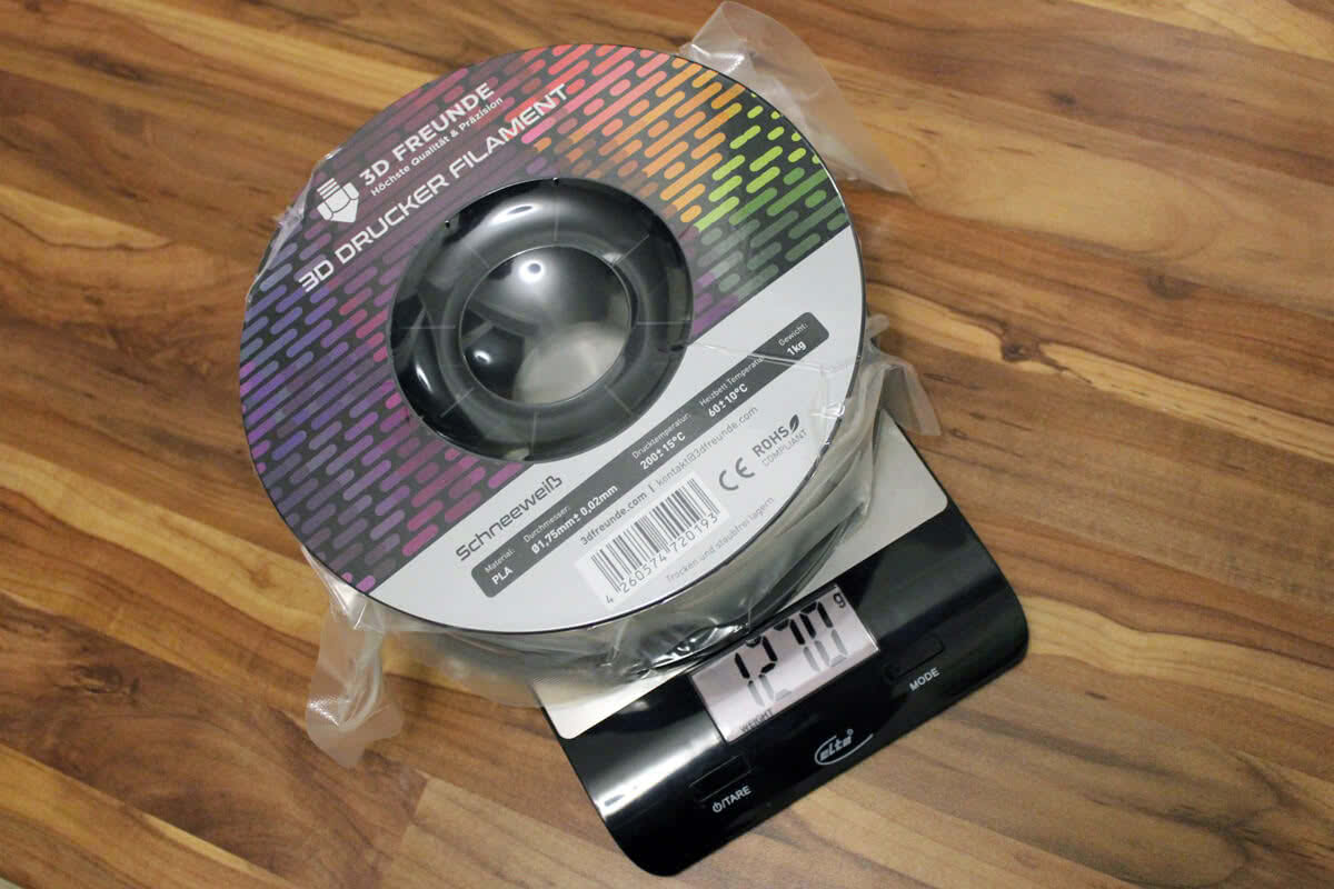 Die Verkaufsmenge beträgt bei diesem PLA wie auch bei den meisten anderen 1 kg. Das Bruttogewicht liegt dabei ohne der Kartonverpackung zwischen 1260g und 1290g. Das ist ein sehr hoher Wert, zumal das für rund 1040g bis 1070g Nettogewicht sorgt. 3D FREUNDE ist hier also nicht geizig, sondern überbietet die 1 kg Grenze deutlich.